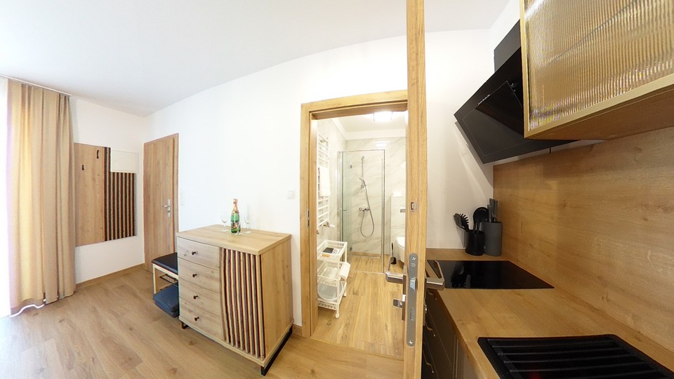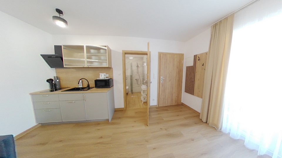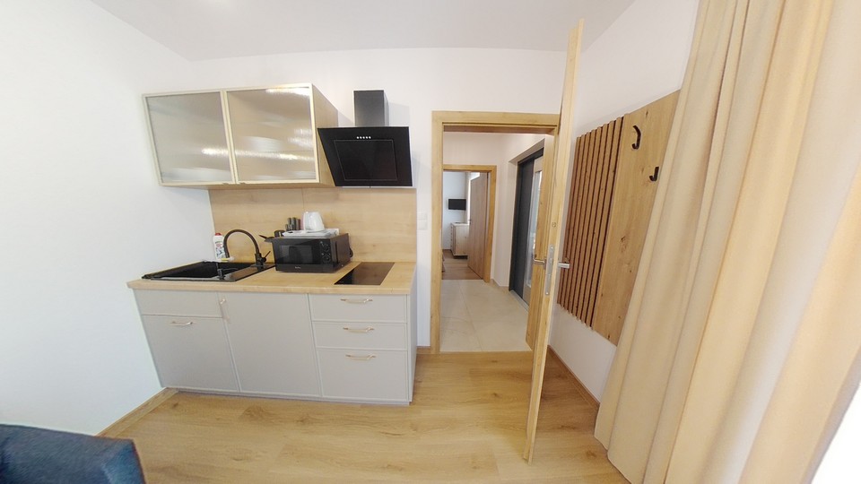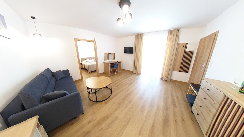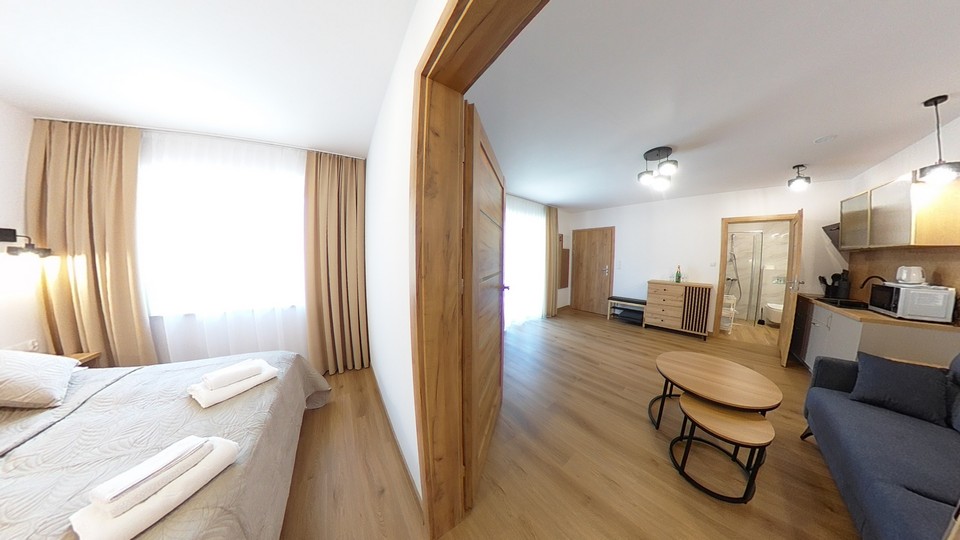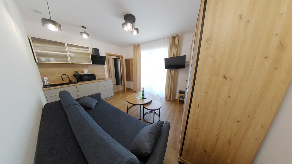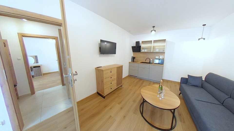 Mniejszy dwupokojowy apartament o powierzchni 25 m 2 z jedną sypialnią z łóżkiem małżeńskim 160 cm , TV, salonem z rozkładaną kanapą, TV, aneksem kuchennym ( mikrofalówka, zlew, lodówka, kuchenka indukcyjna, czajnik bezprzewodowy, niezbędne akcesoria kuchenne i naczynia ), łazienka z prysznicem, suszarką do włosów. Przed apartamentem taras z fotelami i stolikiem tarasowym.