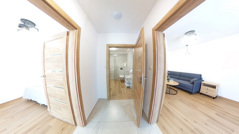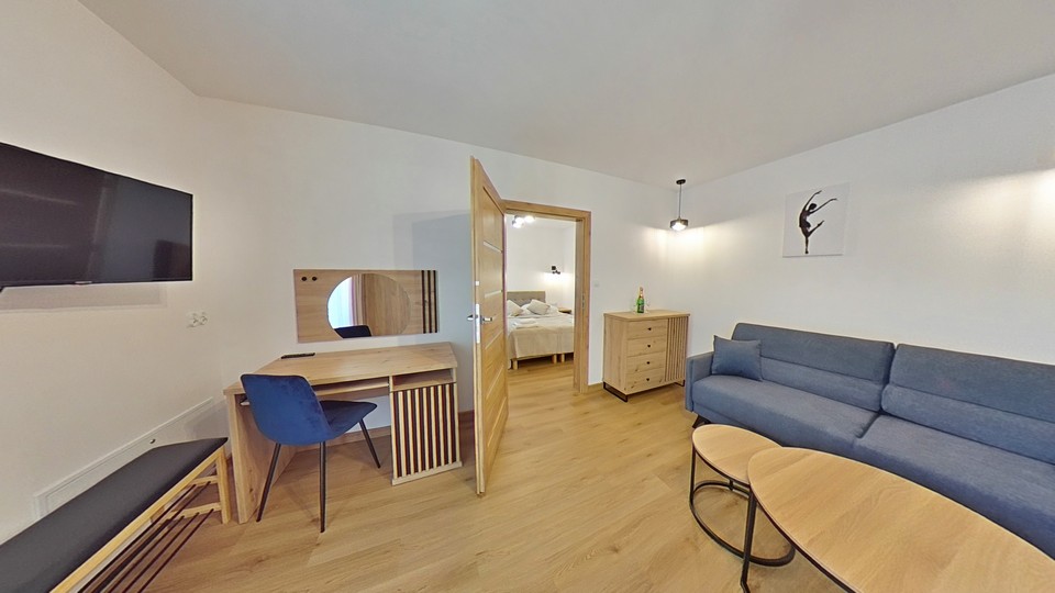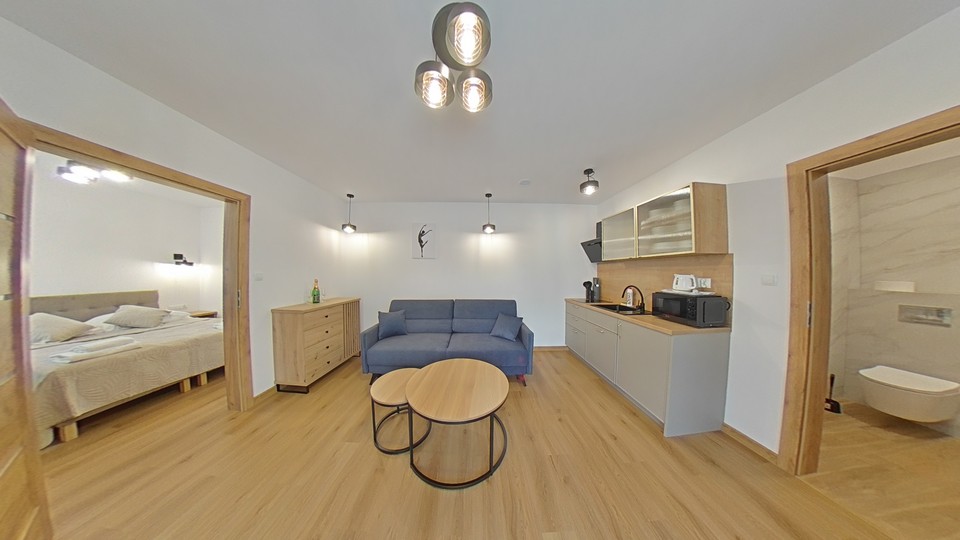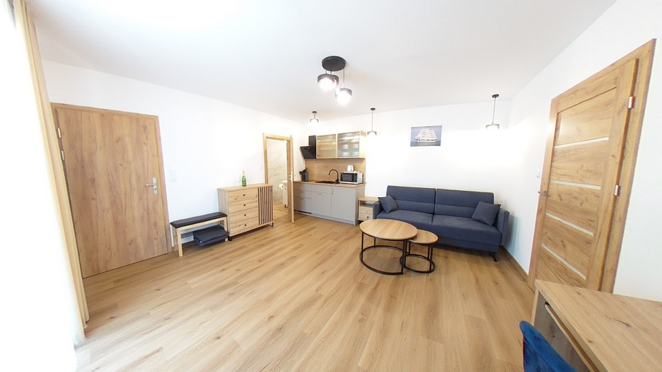 Dwupokojowy apartament o powierzchni 36 m 2 z jedną sypialnią z łóżkiem małżeńskim 160 cm , TV, salonem z rozkładaną kanapą, TV, aneksem kuchennym ( mikrofalówka, zlew, lodówka, kuchenka indukcyjna, niezbędne akcesoria kuchenne i naczynia ), łazienka z prysznicem dostosowana dla potrzeb osób niepełnosprawnych, suszarka do włosów. Przed apartamentem taras z fotelami i stolikiem tarasowym.