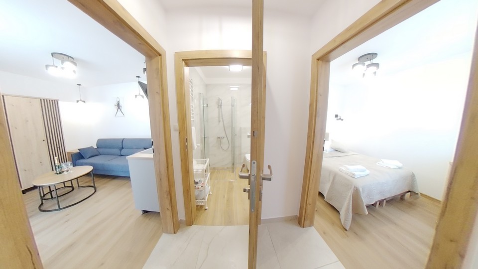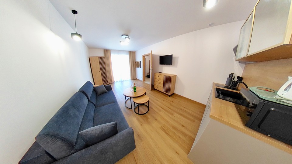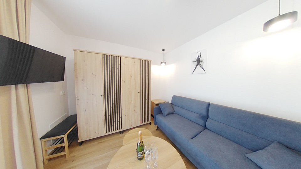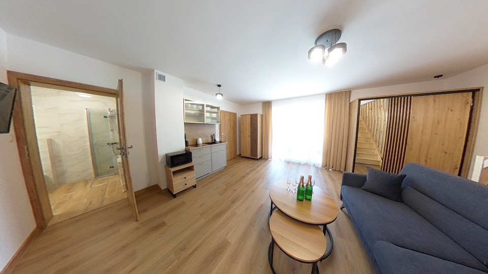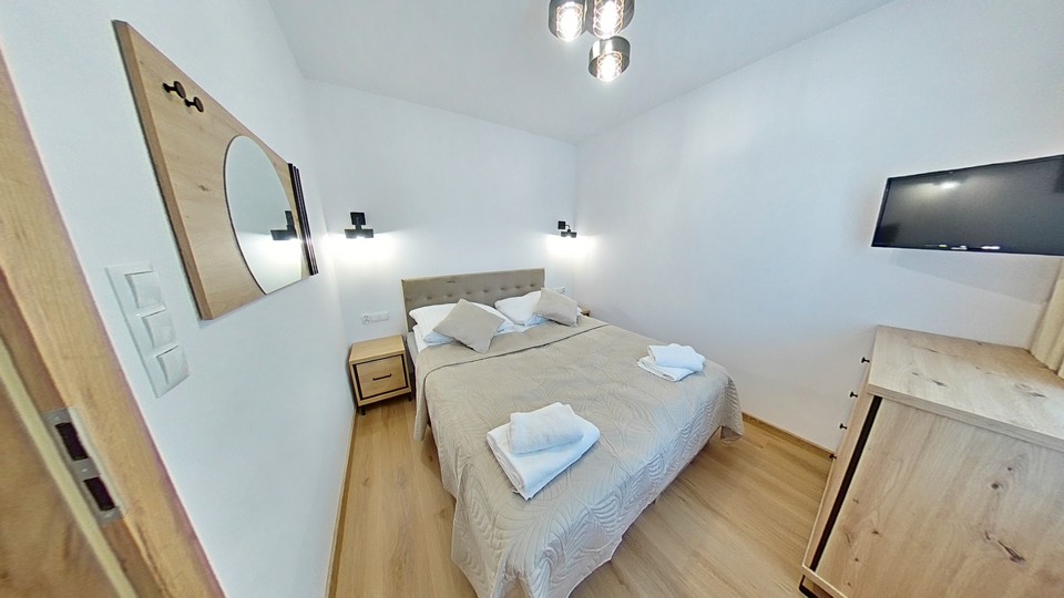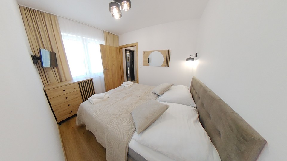 Dwupokojowy apartament o powierzchni 36 m 2 z jedną sypialnią z łóżkiem małżeńskim 160 cm , TV, salonem z rozkładaną kanapą, TV, aneksem kuchennym ( mikrofalówka, zlew, lodówka, kuchenka indukcyjna, niezbędne akcesoria kuchenne i naczynia ), łazienka z prysznicem, suszarką do włosów. Przed apartamentem taras z fotelami i stolikiem tarasowym.