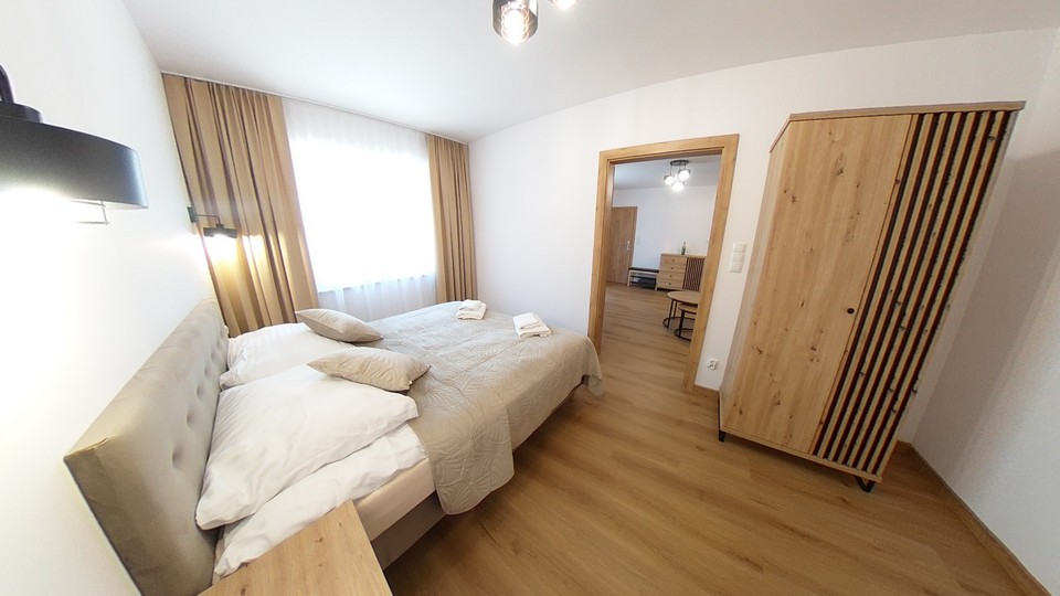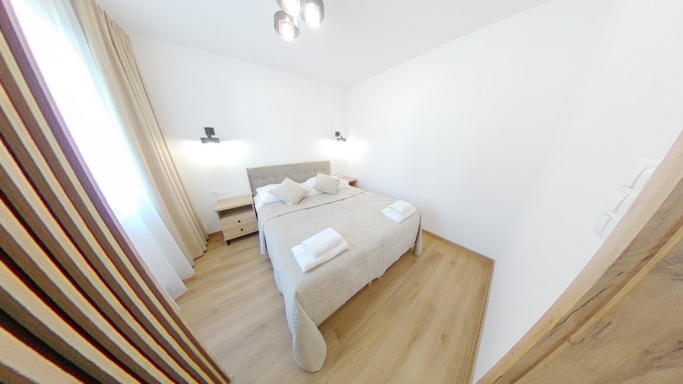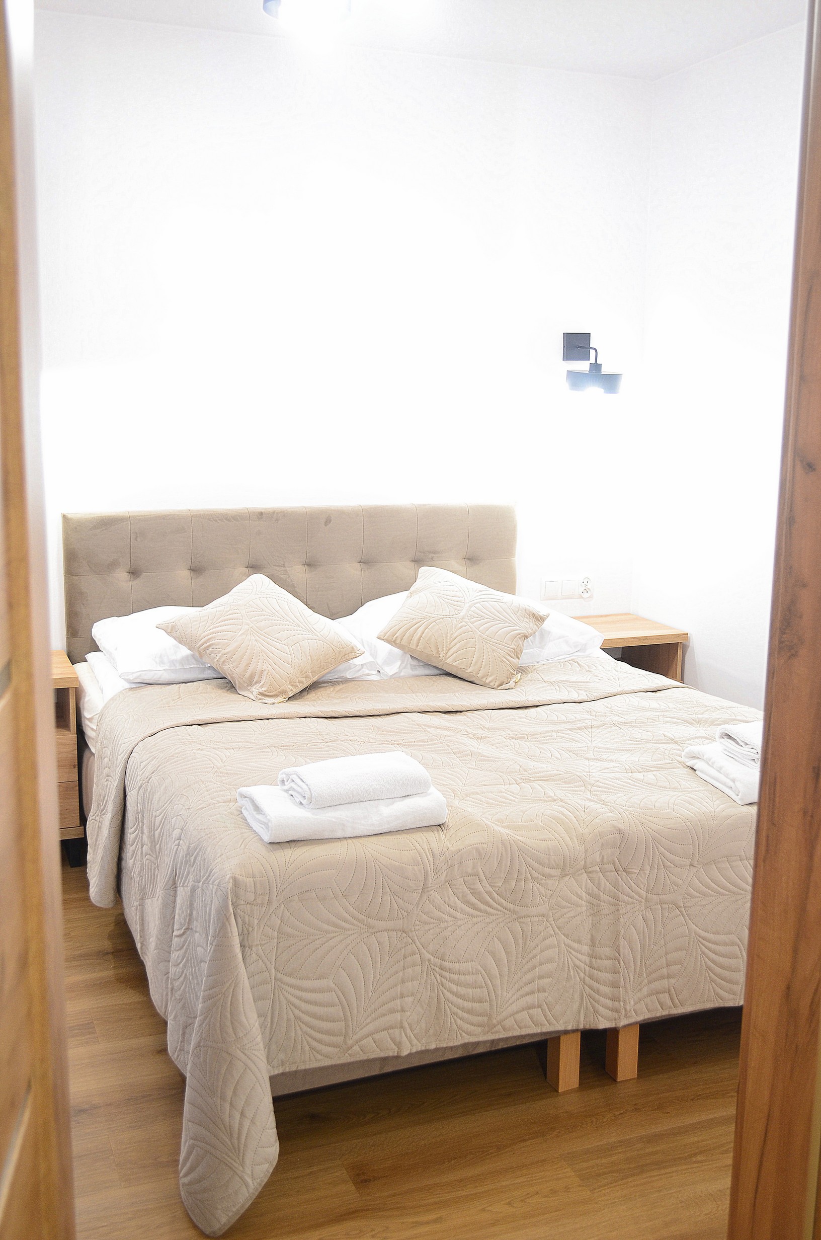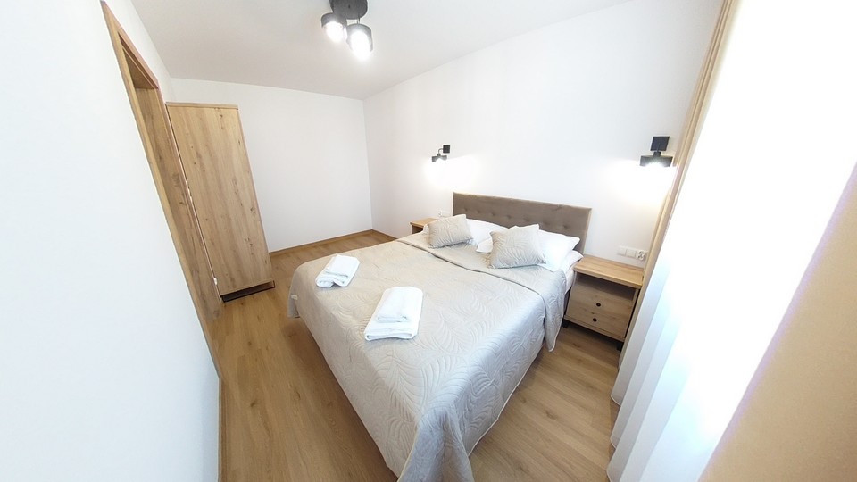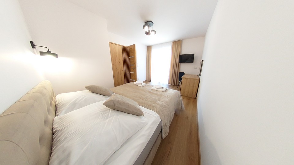 Dwupokojowy apartament o powierzchni 36 m 2 z jedną sypialnią z łóżkiem małżeńskim 160 cm , TV, salonem z rozkładaną kanapą, TV, aneksem kuchennym ( mikrofalówka, zlew, lodówka, kuchenka indukcyjna, niezbędne akcesoria kuchenne i naczynia ), łazienka z prysznicem, suszarką do włosów. Przed apartamentem taras z fotelami i stolikiem tarasowym.