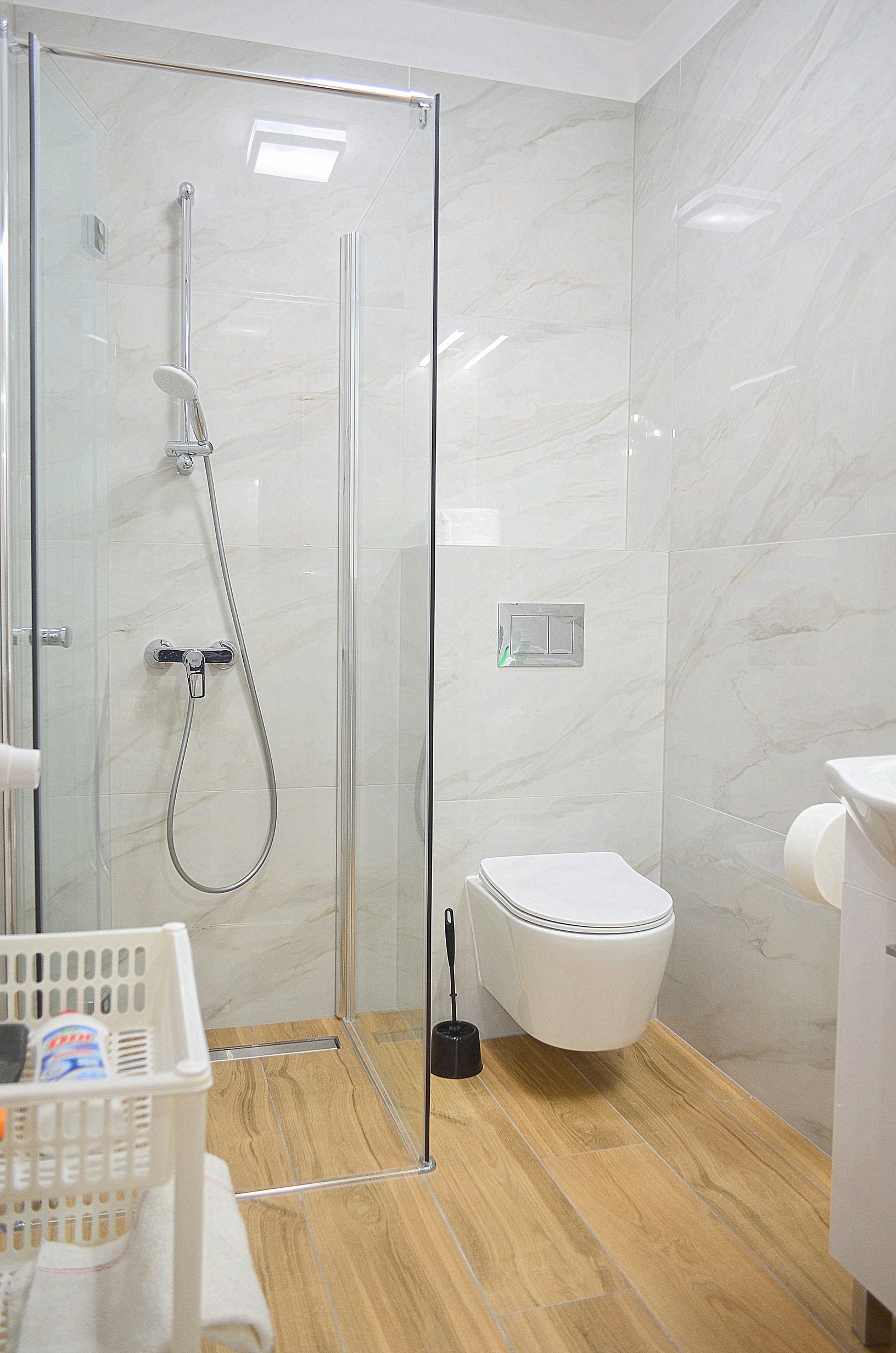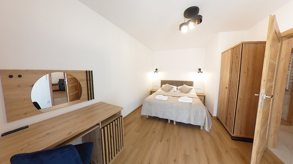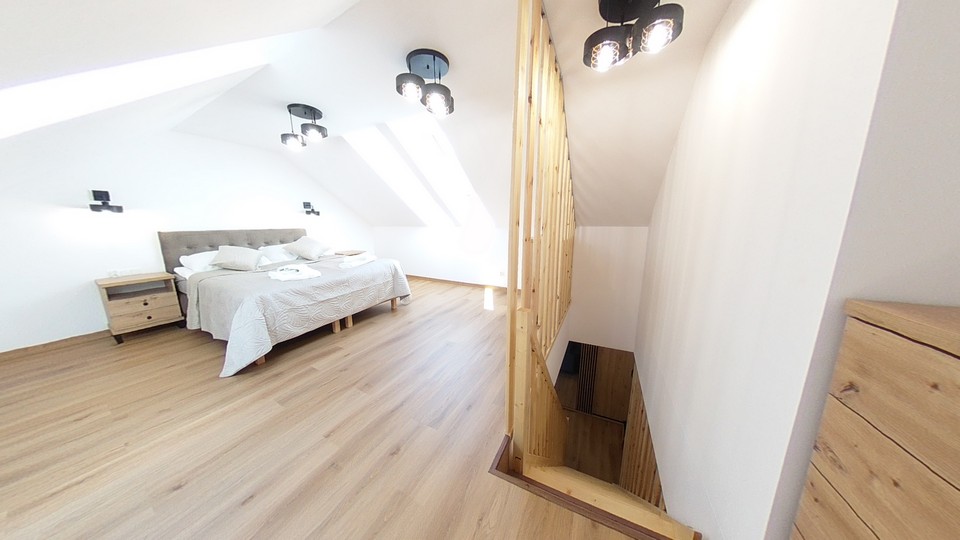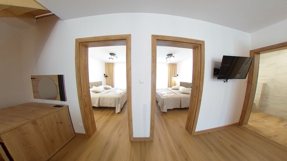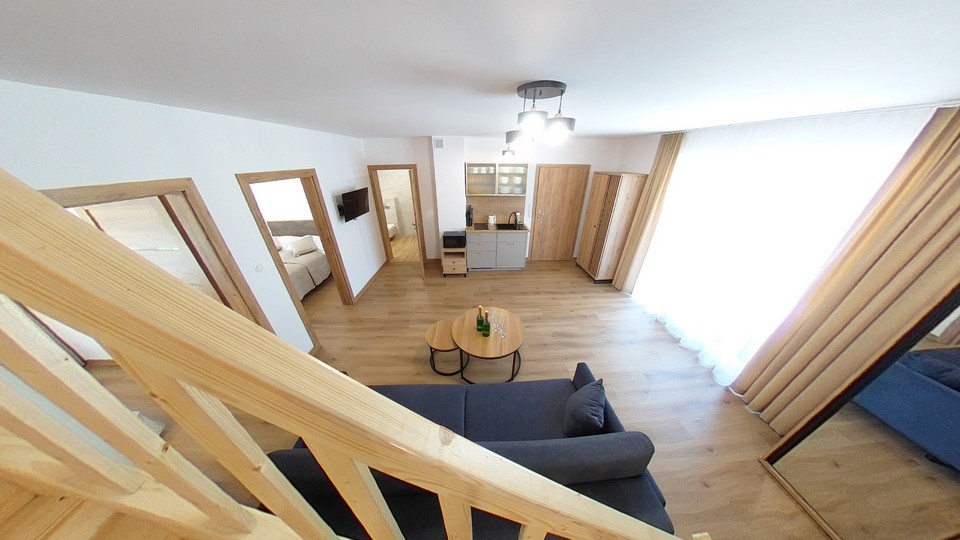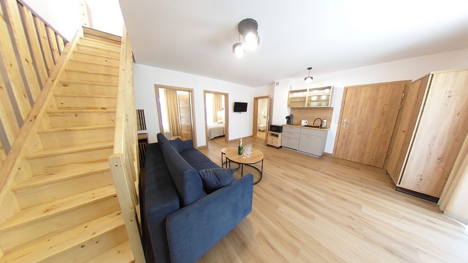 Dwupoziomowy czteropokojowy o powierzchni parter 53 m 2 , poddasze 17 m 2, apartament z trzema sypialniami z łóżkami małżeńskimi 160 cm, salonem z rozkładaną kanapą, TV, aneksem kuchennym ( mikrofalówka, zlew, lodówka, kuchenka indukcyjna, niezbędne akcesoria kuchenne i naczynia ), łazienka z prysznicem, suszarką do włosów. Przed apartamentem taras z fotelami i stolikiem tarasowym.