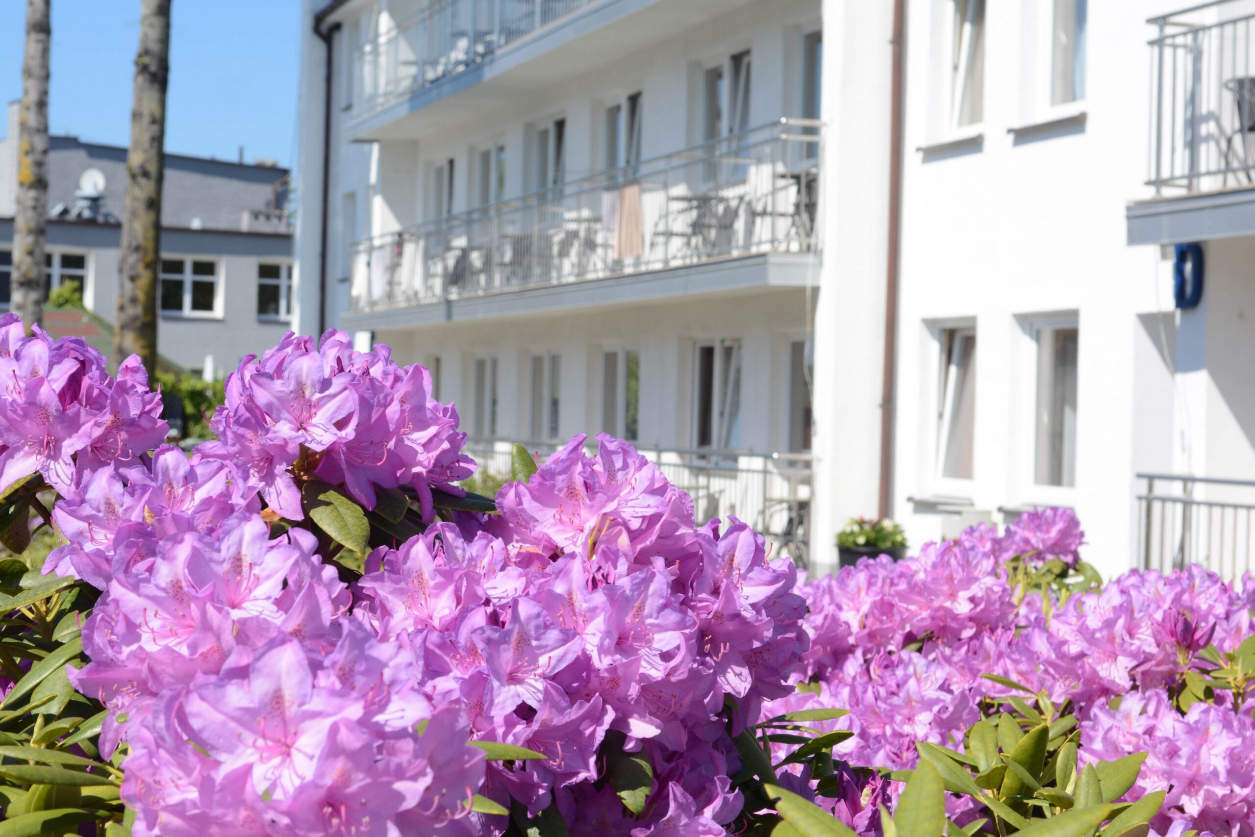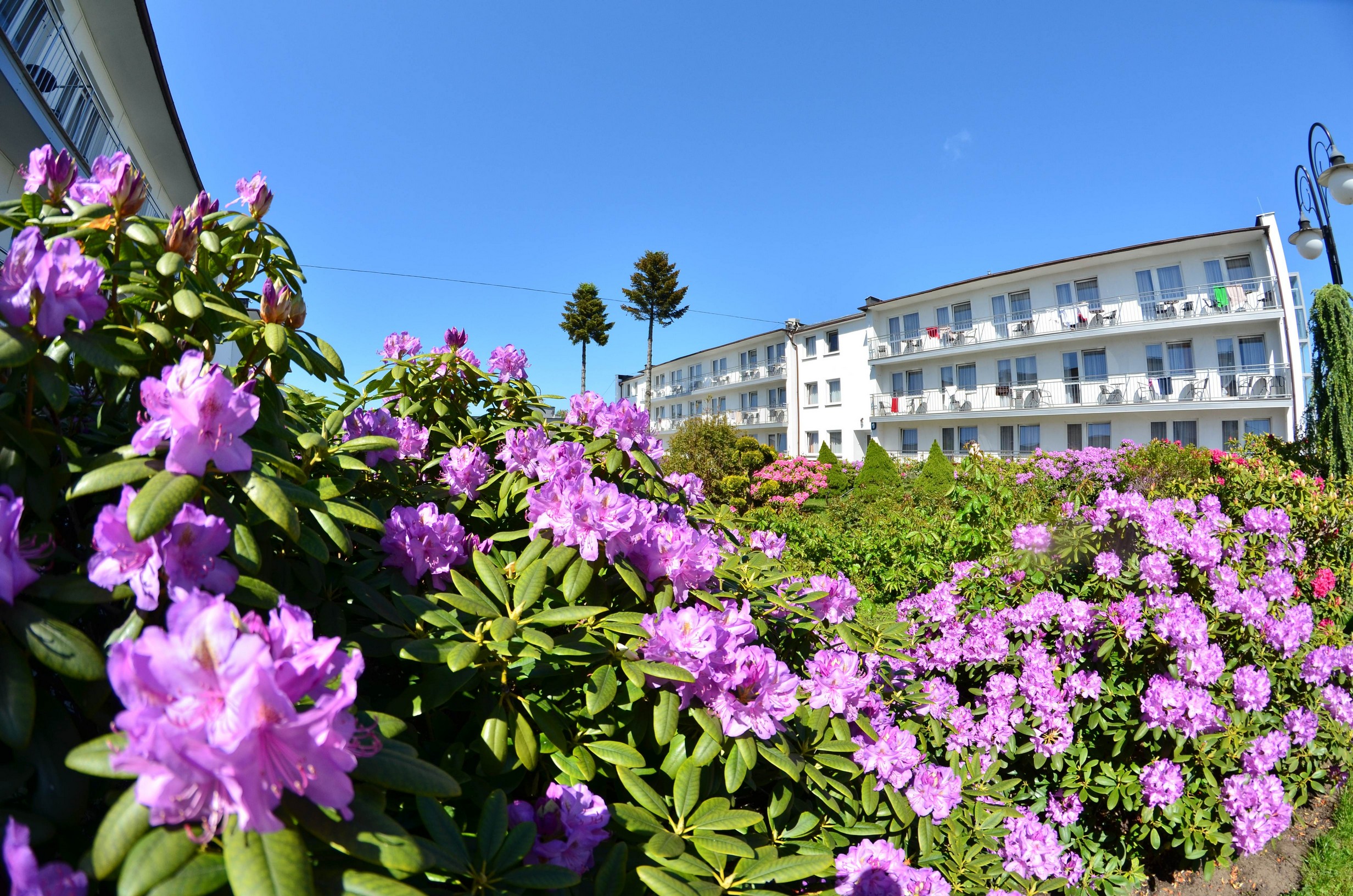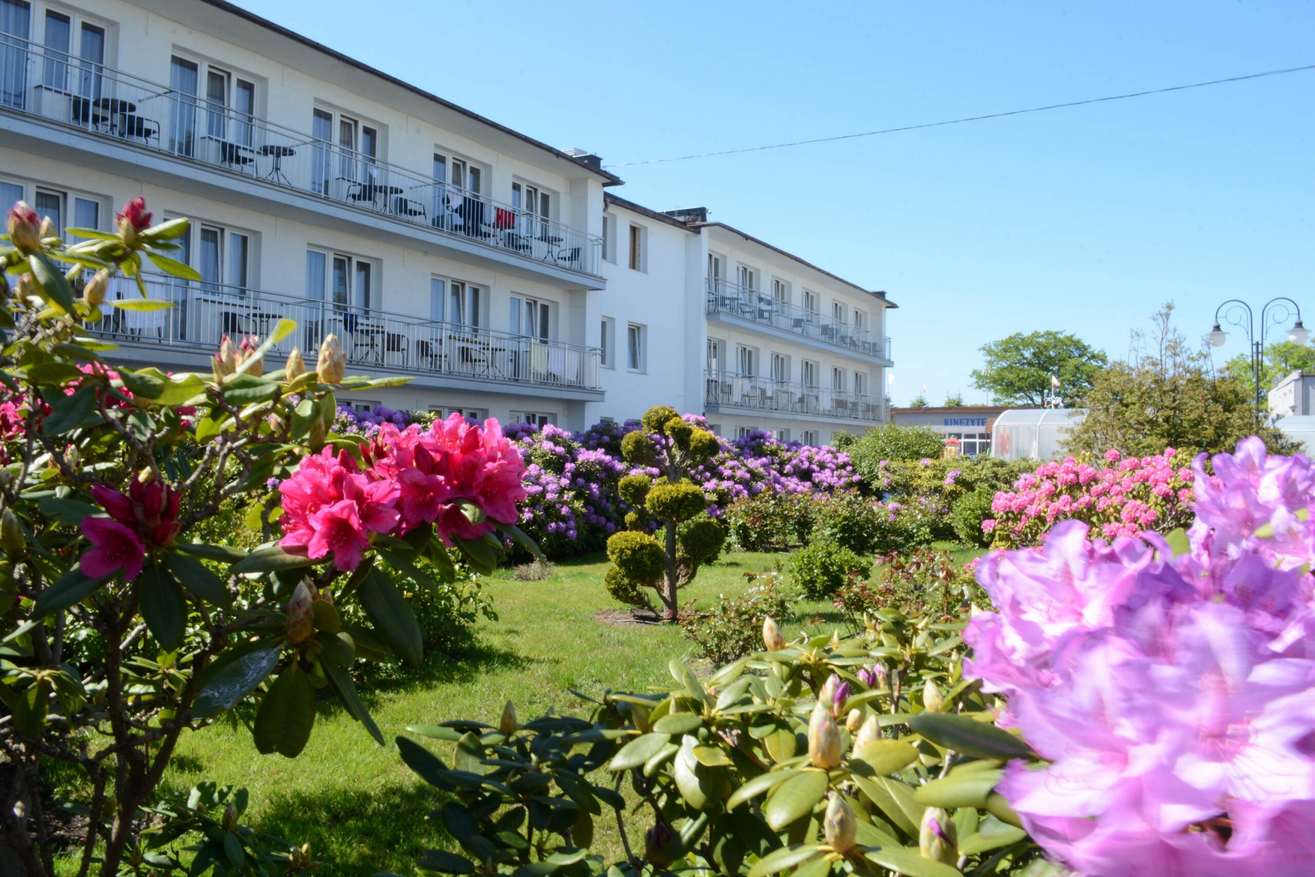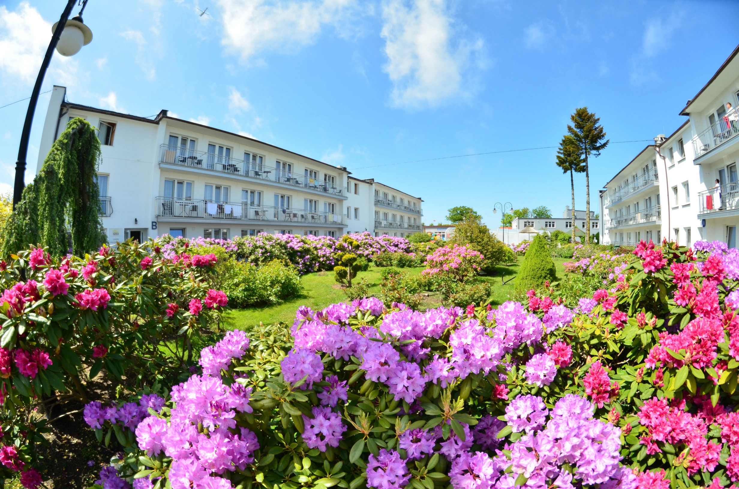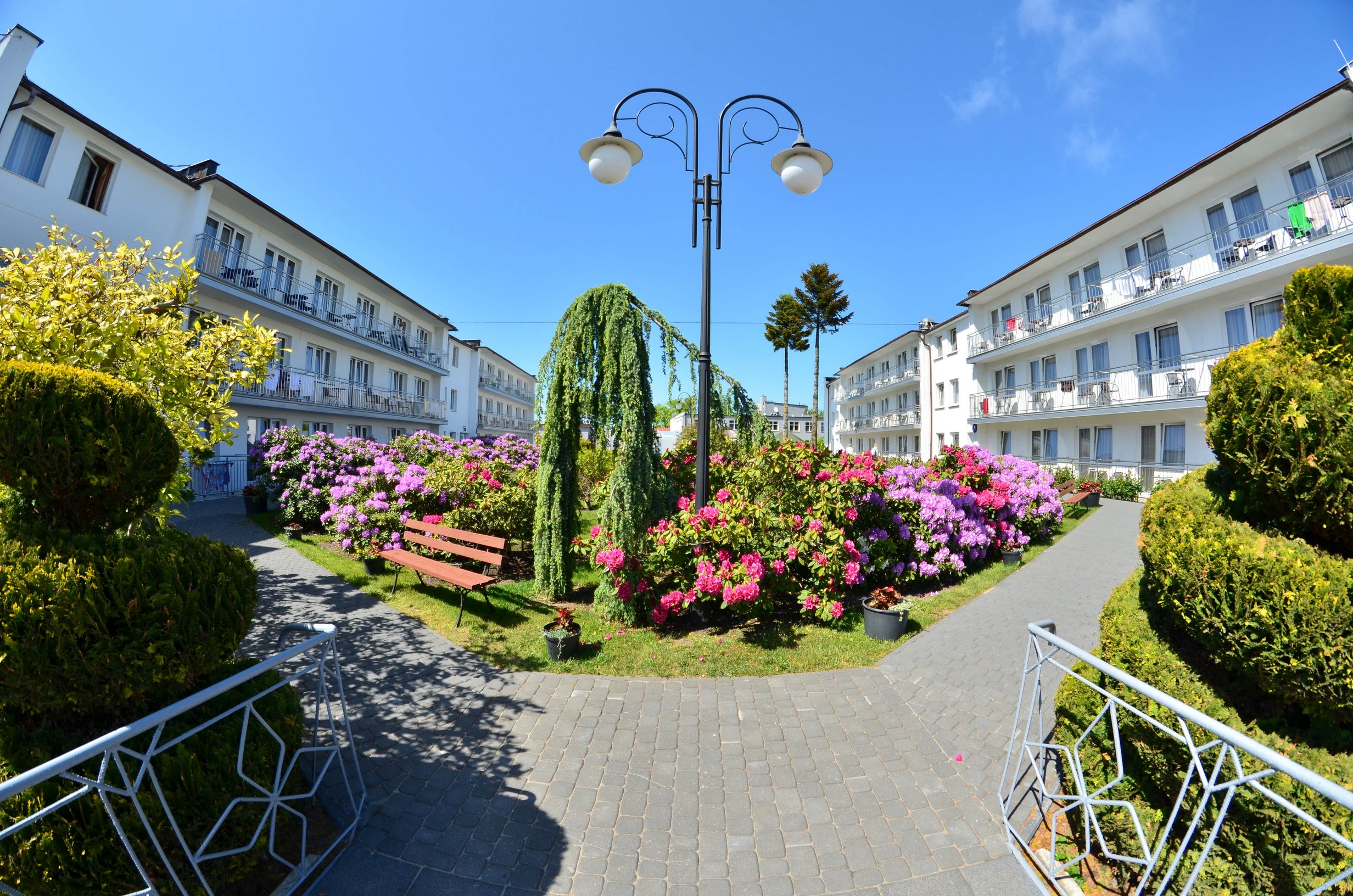 Pięknie zagospodarowany duży zielony teren mnóstwo kwiatów i krzewów